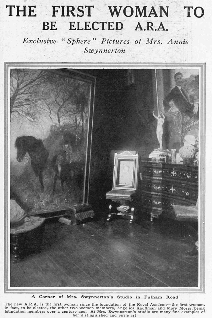 In an article on Annie’s admission to the Royal Academy, published 9 December 1922 in the The Sphere newspaper, there is a photograph of a corner of Annie’s studio in which is visible her Portrait of Count Zouboff (painted over a decade earlier and now in the Tate) and an otherwise unknown equestrian painting which is titled here ‘1922 photograph‘.