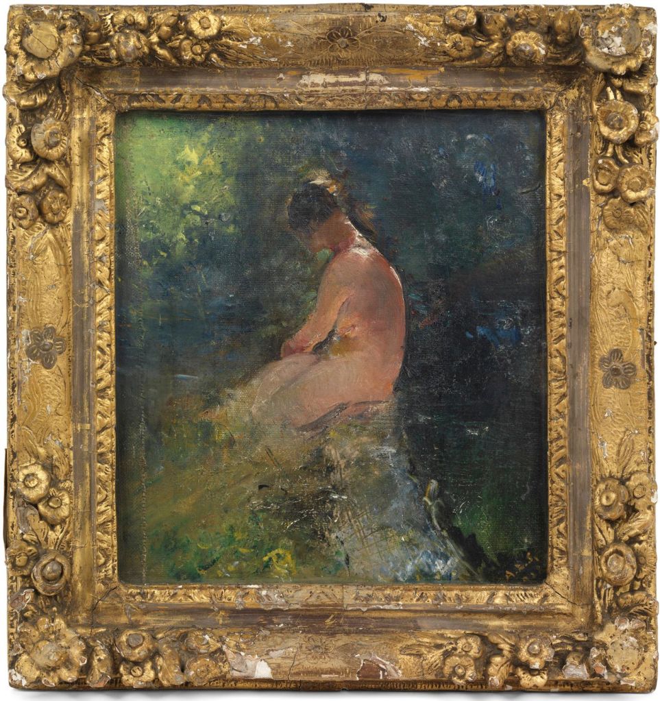 - Description: A woman sitting sideways on, face turned away, body in flesh tones, the surroundings dark green, blue and yellow.