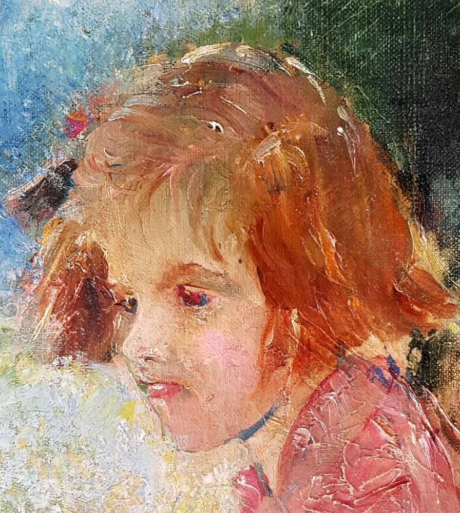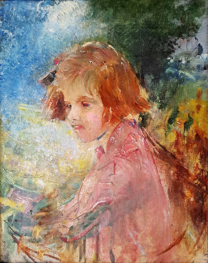 - Description: Oil sketch of the head and shoulders of a young, red-haired girl, shoulders sideways on, facing to the viewer’s left, head turned three-quarters towards the viewer.