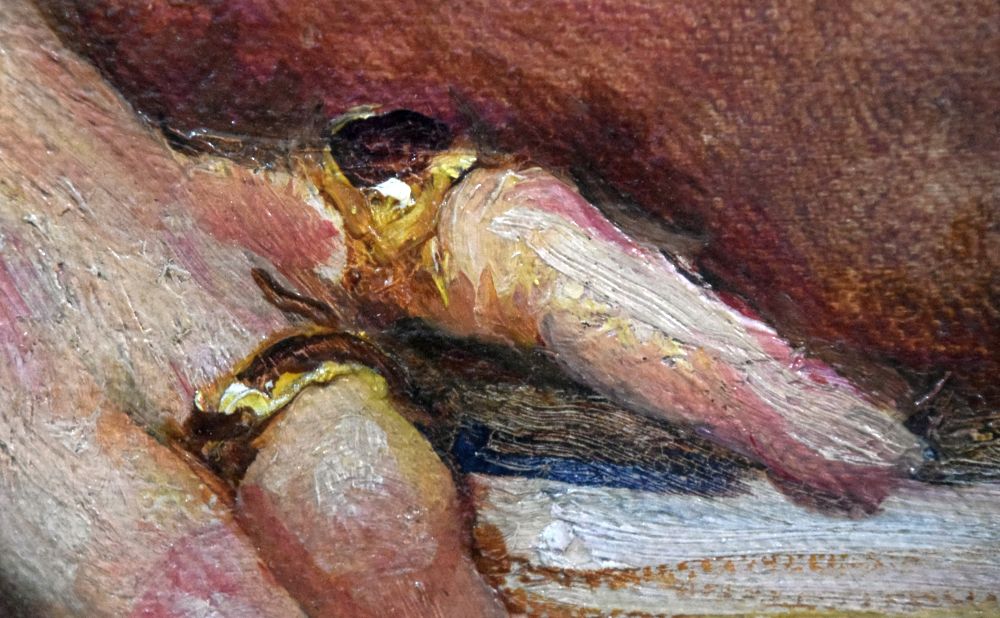 In Annie’s posthumous studio sale there were at least two ‘studies of hands’ in the ‘unfinished and unstretched’ part of the auction, lot 145, ‘A study of hands‘, sold with three other paintings, and lot 150, ‘Studies of hands, etc.’, three paintings sold together under this title. A ‘Study of hands‘ was auctioned at Christie’s, 6 Mar 1986, the dimensions given are almost identical to this work, so presumed here to be the same painting.