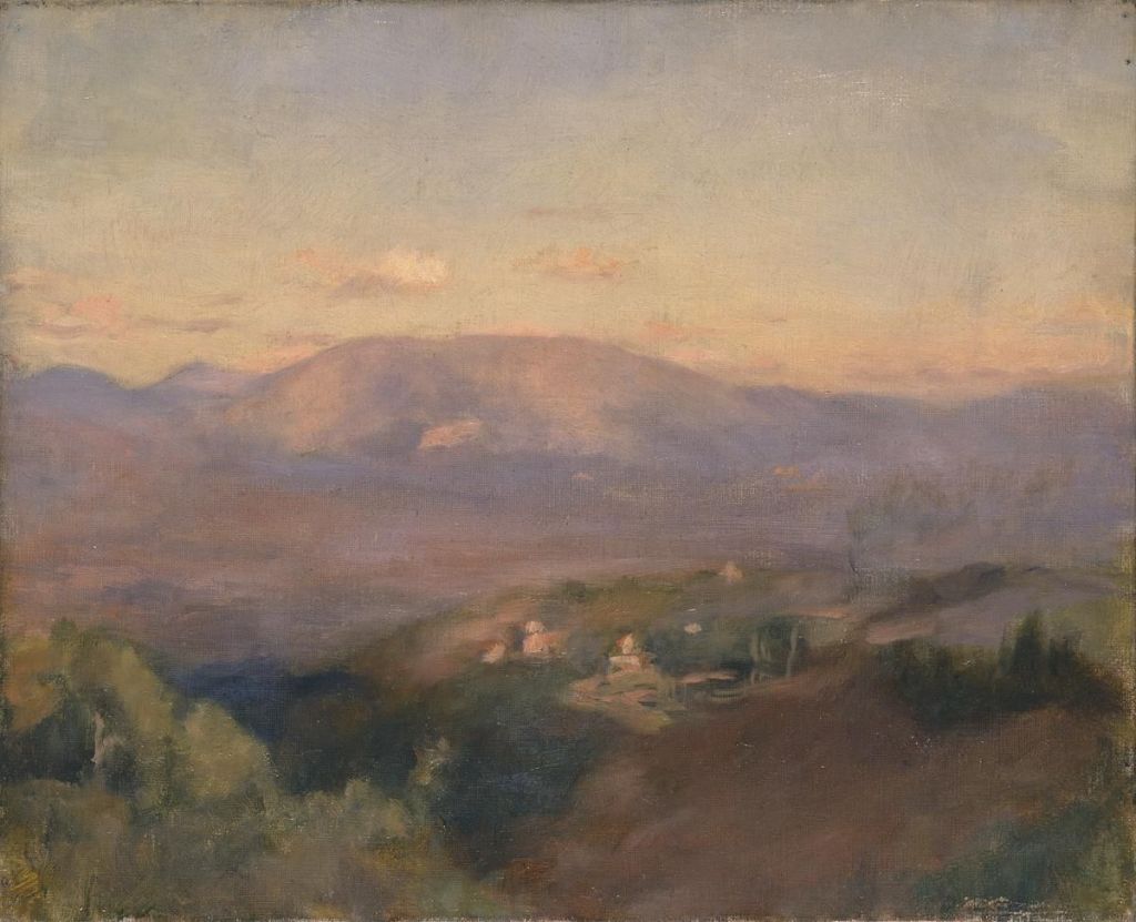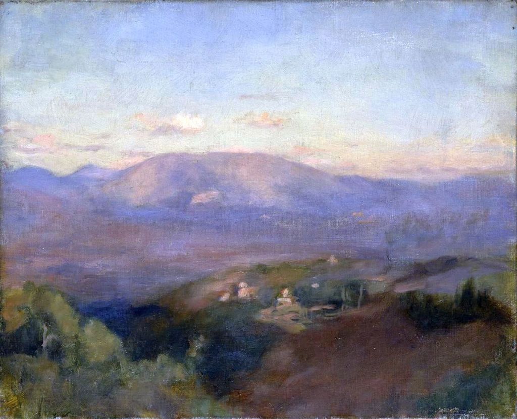 The mountain in the background, just left of centre, is Monte Subasio, 1290m (4,230 feet). The town of Assisi is hidden in the blue-purple wash across the centre of the picture just below the mountain.