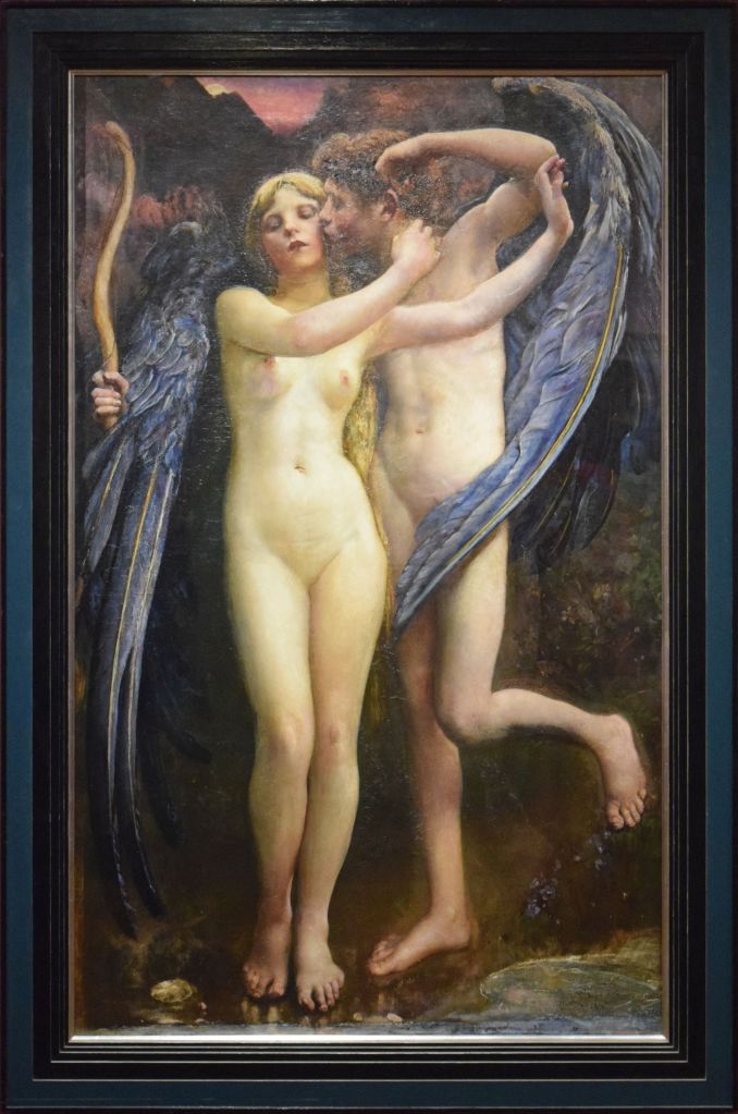 In the original myth, Psyche is a young girl whose beauty rivals the goddess Venus, so Venus tells Cupid to wound Psyche with one of his magic arrows and cause her to fall in love with something or someone hideous. However, Cupid accidentally scratches himself with one of his own arrows and so falls madly in love with Psyche upon seeing her, and whisks her away to a luxurious mansion. She, a mortal, is never allowed to see or know who her lover is (hence her eyes being closed in the painting). Eventually Psyche plays a trick to discover Cupid’s identity, but in the process is also wounded by one of his arrows, causing her to fall deeply in love with him also. The couple are forced to separate and have to endure many ordeals, but eventually Jupiter takes pity on them and makes Psyche immortal so that the couple can be together forever.