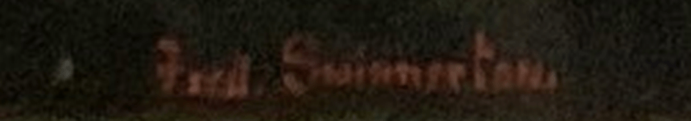 The mountain scene was one of two watercolours sold togeather. The second, a finely executed river scene, had no signature or any marks internally or externally identifying it’s origin (was able to remove back of frame and examine mounting, back of picture and frame-concealed edges of watercolour) – “WHATMAN’S WATER COLOUR SKETCHING BOARD / WINSOR & NEWTON, Ltd., LONDON, ENGLAND” printed on the back of the card the watercolour was painted on, along with the stamp “S. J. WISEMAN, / FIne Arts Repository, / 54, ABOVE BAR, SOUTHMPTON“. The business S. J. Wiseman was present at that address from 1887 to 1939. No provenance information for either work. Apart from belonging to the same era as the mountain scene, being sold with it and of a similar skill level, there is no evidence to attribute the river scene to Frederick. The WISEMAN stamp on the card suggests the work was painted in the UK, although the card could have been taken or posted abroad, of course.