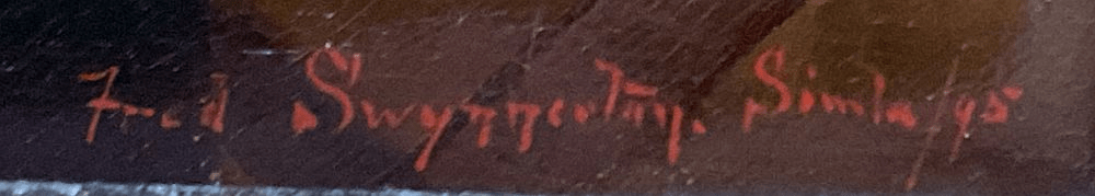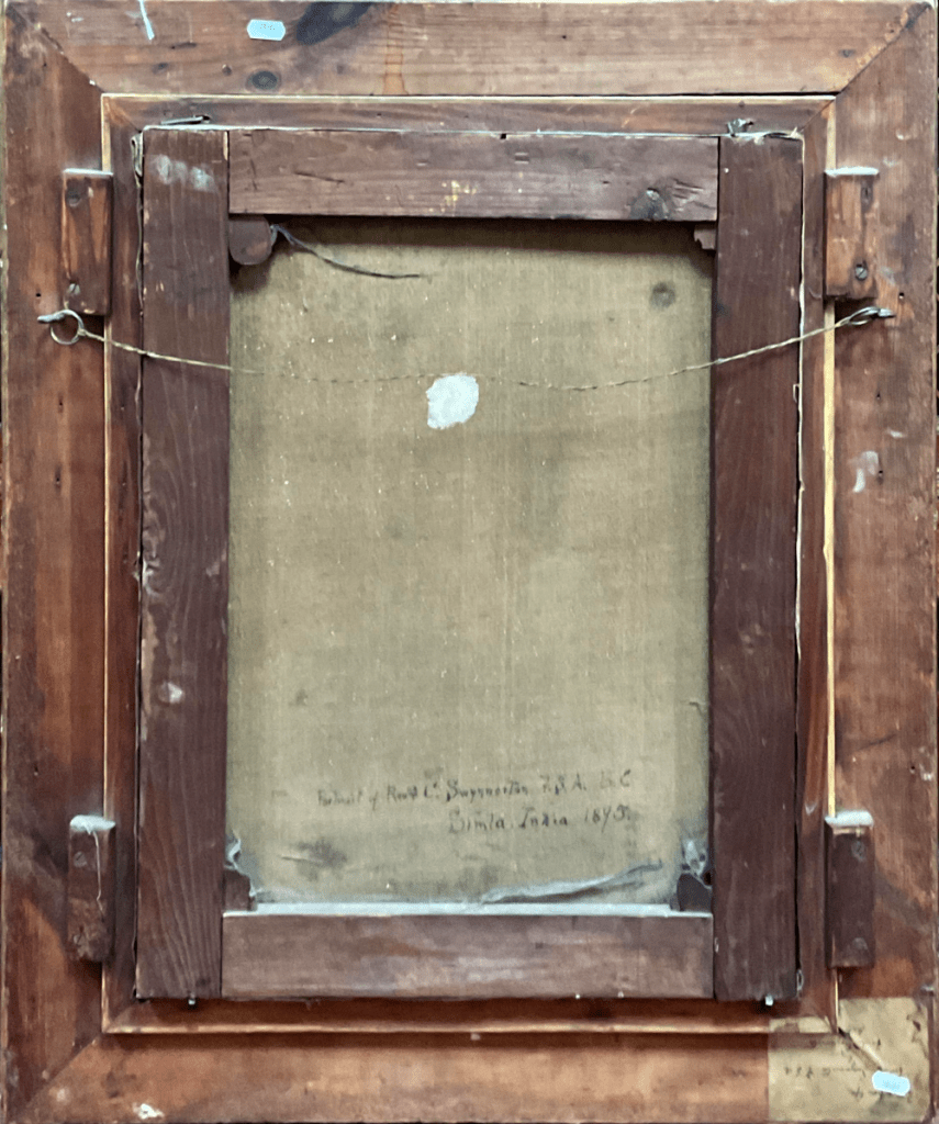 - Signature/date/other text: “signed and dated lower right and verso”; “Fred Swynnerton. Simla 95” visible on canvas front lower right; “Portrait of Rev’d C. Swynnerton F.S.A. B.C. / Simla. India 1895” on canvas rear (Sheffield Auction Gallery).