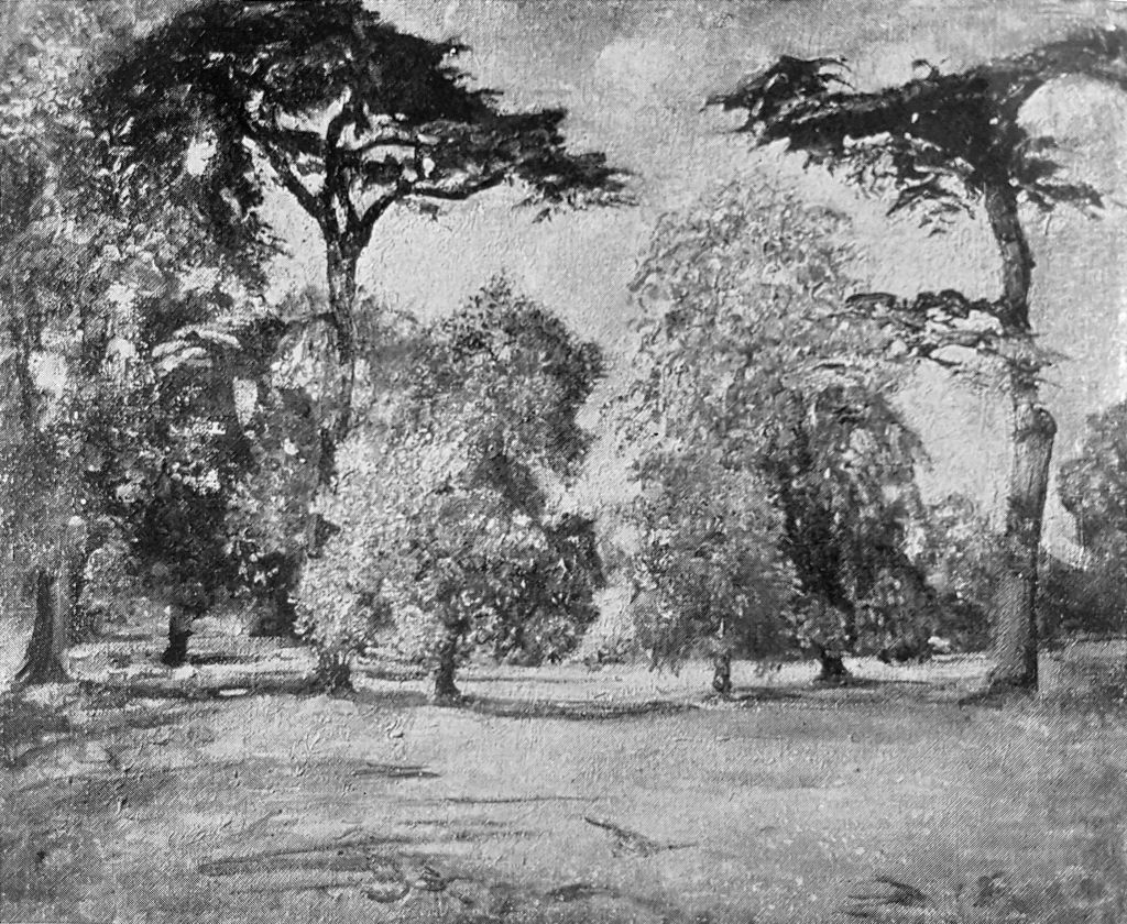 - Description: Only known from black-and-white image in Royal Academy Illustrated, 1931; a parkland scene with several well-grown trees mid-distance.