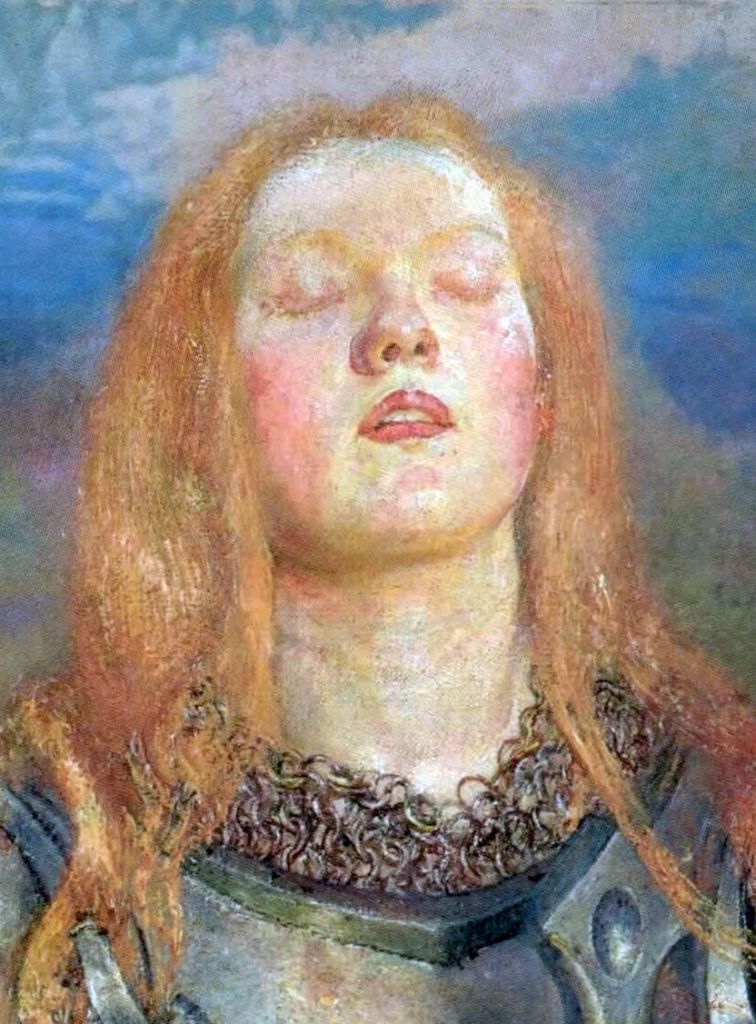 with the strong expression of the face – an expression without the aid of eyes, for they are closed – might also be a Joan of Arc; the head is thrown back, in intense meditation, and the hands rest on the cross of a sword.