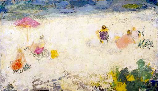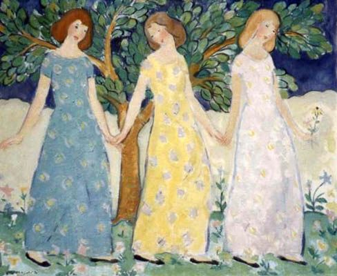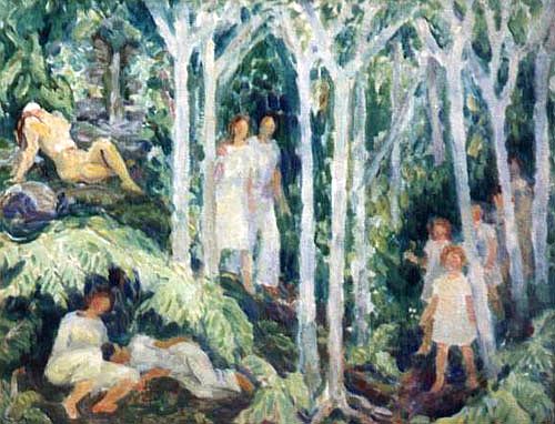 Unlike Annie, Mabel was not a figure who courted controversy, but simply persued her love of painting and colour throughout her long life, becoming increasingly deliberately naive and abstract in style over the years. She was also a bit of a ‘symbolist,’ though not with the political metaphores found in some of Annie’s work. Like Annie, her expressive use of colour was influenced by the non-representatial art of the era, and she switched between straightforward portraits and almost totally abstract works st times. Also, like Annie, she had a love of working outdoors.