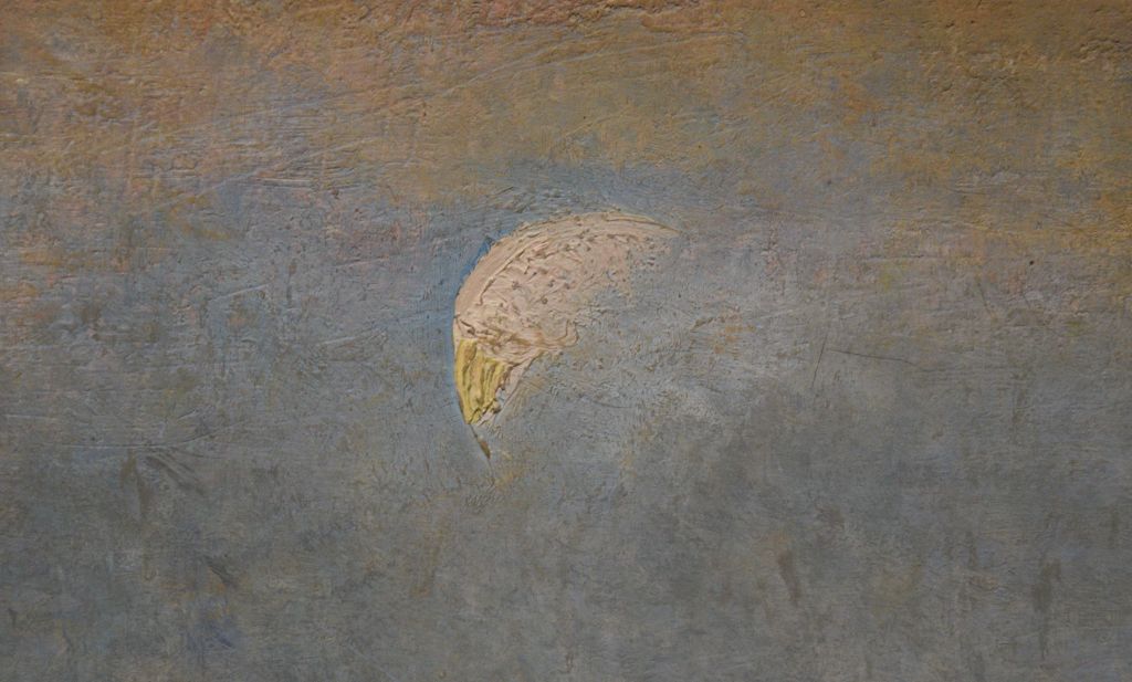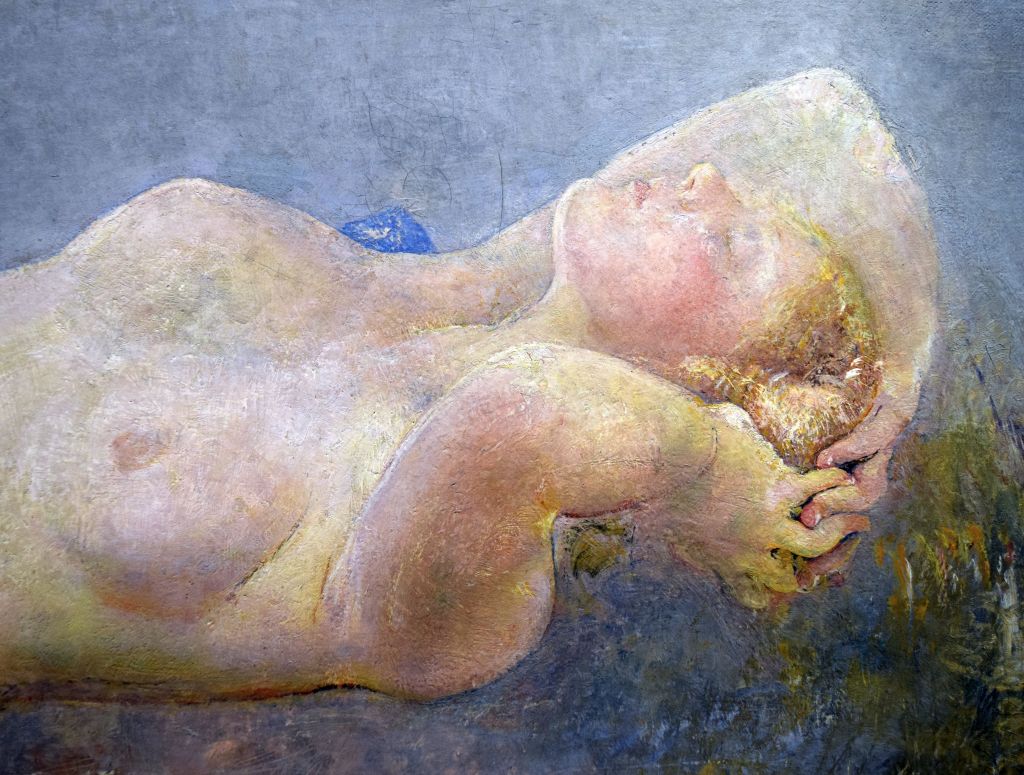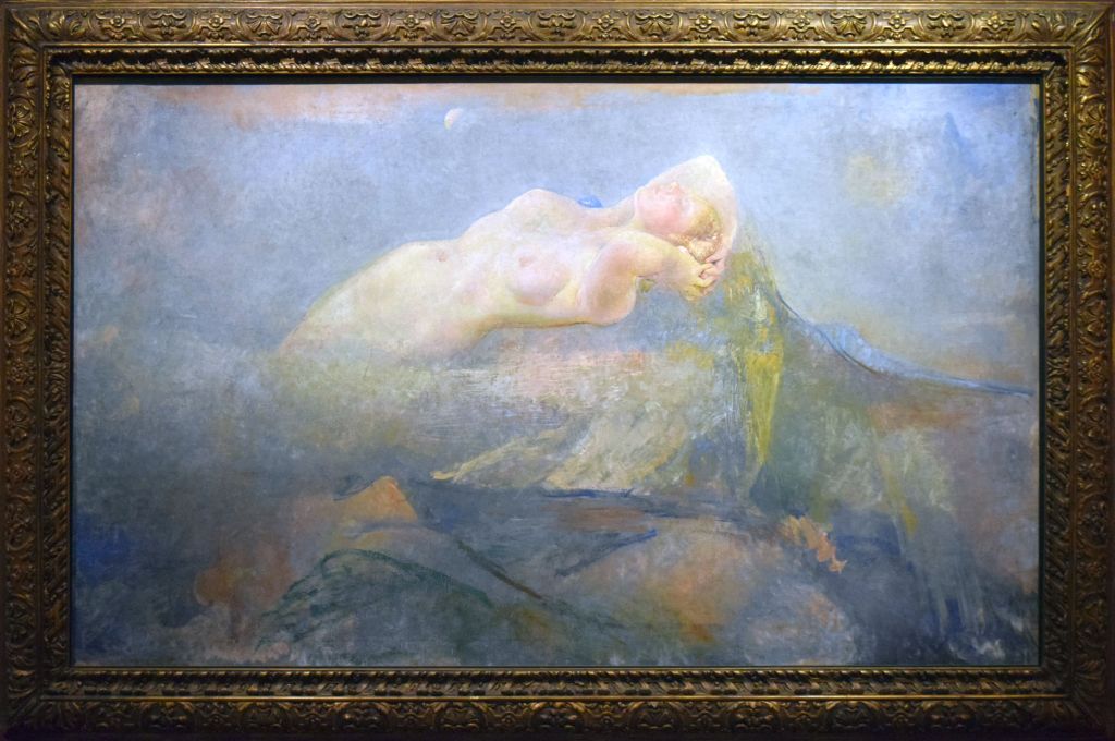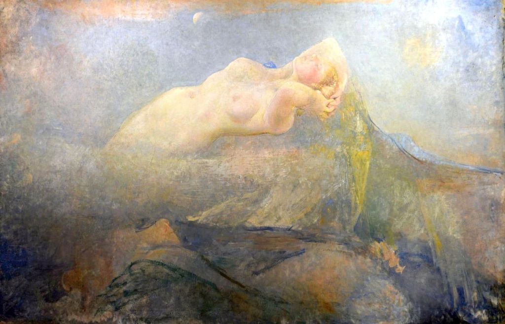 - Description: “A mystical scene depicting a naked woman reclining across what appears to be a mountain range, her hands reaching back clasped behind her head and her eyes closed. Her lower torso disappears into a mist to the left, a pale moon shining overhead. The painting is predominantly in blue, grey and lilac tones” (artuk.org).