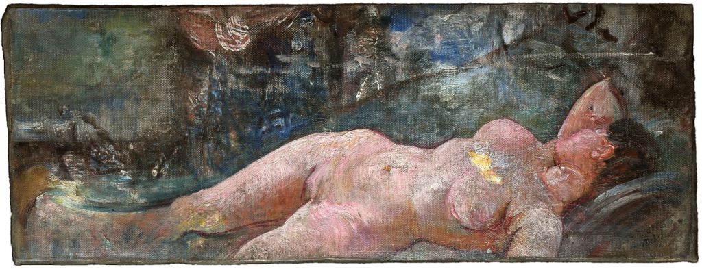 - Description: A reclining female nude figure, face turned away, background of subdued greens, blues and pale pigments. There is a patch of yellow pigment on the chest, possibly a butterfly or butterflies. Has the appearance of an unfinished or trial piece.