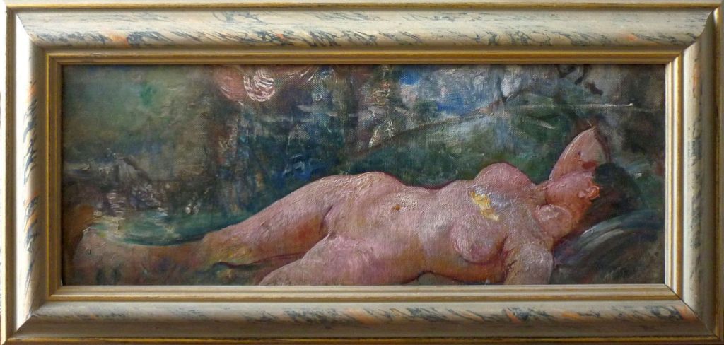 ‘Nude in landscape’ is written in modern marker pen on the back of frame and the canvas has been relined.