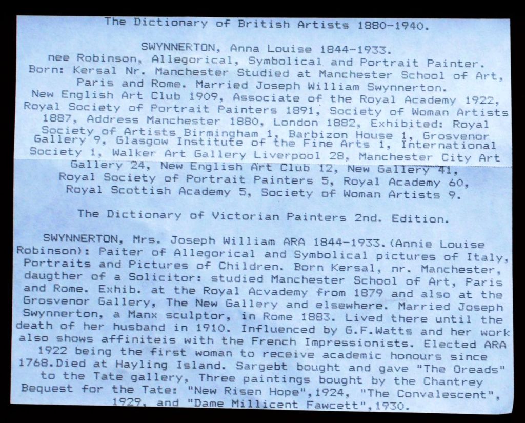 - 2018 Apr 24 – Auctioned eBay, “Good condition, has been professionally relined … an original Oil on Canvas Painting by Anna Louise Swynnerton, ARA (1844-1933). This painting is thought to be a preparatory study for a larger work. / English, circa 1870. / Unsigned, with an inscription on the stretcher verso and a paper label with details of her listings in The Dictionary of British Artists 1880 -1940 and the Dictionary of Victorian Painters 2nd. Edition. / Presented in a good quality hand finished frame”, sold: £438.