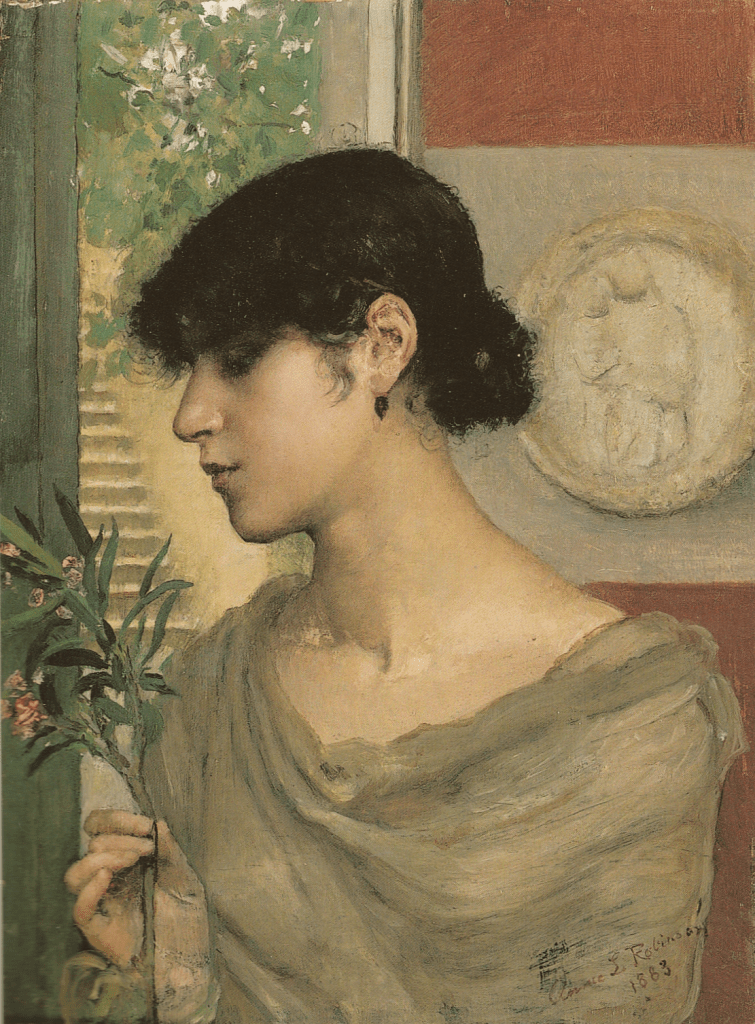 - Description: a young woman, shoulders turned three-quarters to the viewer, head in profile, holding a sprig of flowering oleander, steps and architectural features in the background.