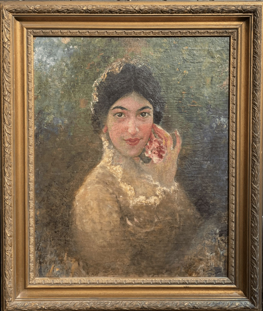 - Description: Bust portrait of a dark-haired woman, body turned halfway to the sitter’s left, face looking almost directly at the viewer. Her left hand is held up to the side of her face with what appears to be a flower in the palm. Background an abstract mottling and detailing increasingly diffuse outside the hair and face. The canvas was cut from a larger work visible in a photograph taken in the early 1930s.