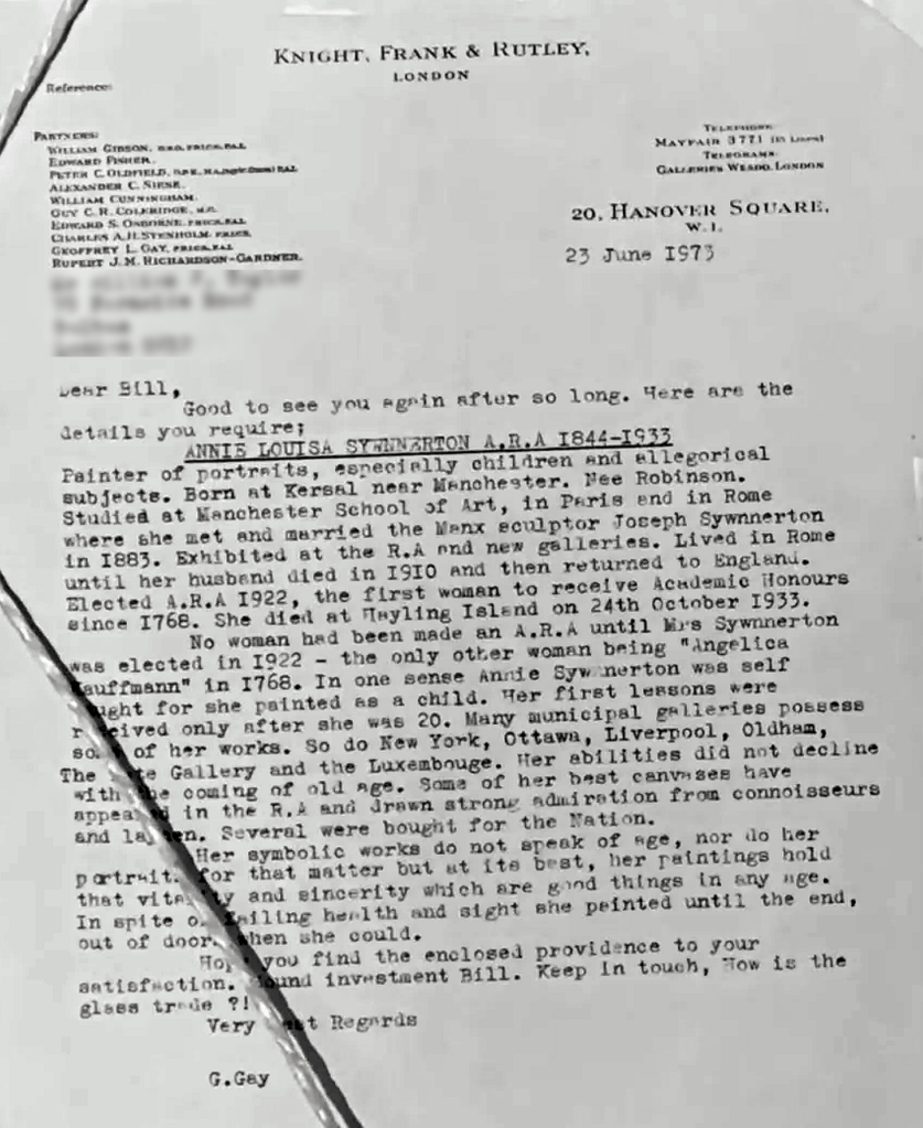 - 1973 Jun 23 – Referenced in letter attached to back of picture (Darnley Fine Art).