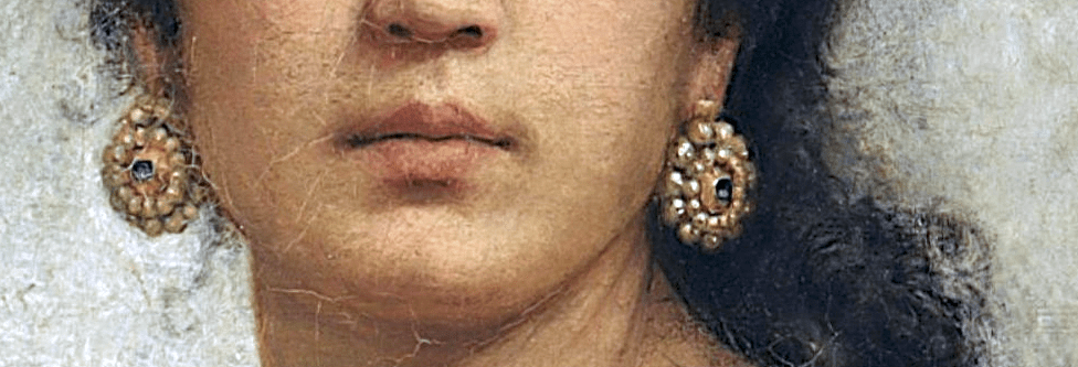 - Description: Bust portrait of a woman, body turned to the viewer’s left, face to the viewer but eyes looking to the sitter’s left, wearing ornate, circular earrings, only the right hand visible carrying (unclear) rolled scrolls?