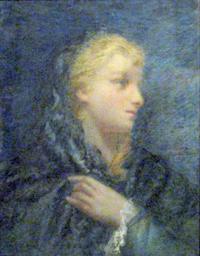 - Description: Bust portrait of a young woman, face turned almost profile to the viewer’s right, only her left hand visible, holding clothing which is partly covering her head, with a lace cuff.