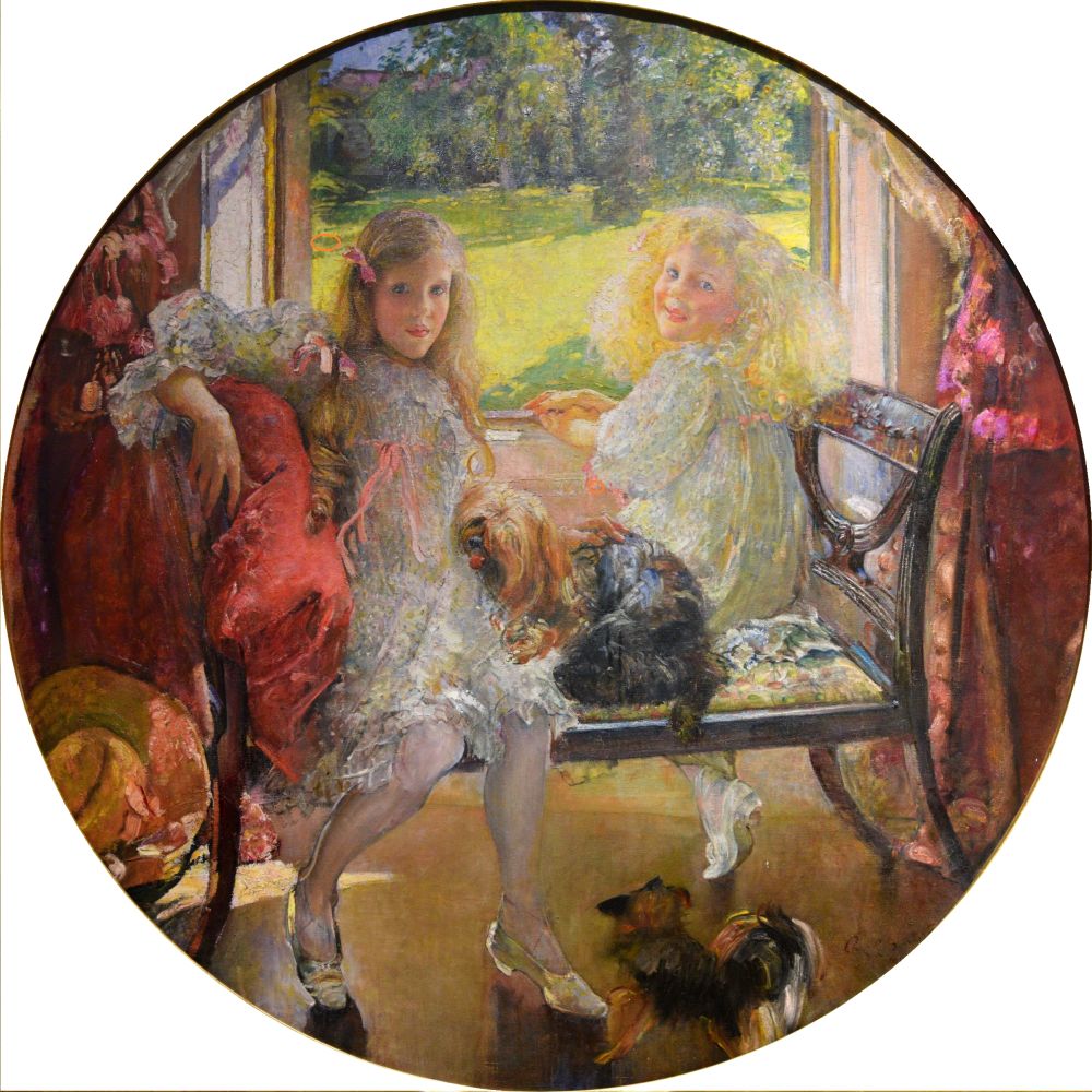 - Description: Two young girls in white dresses, seated on an ornate chair-bench in an interior with a large window begind them, the girl on the left boldly facing the viewer, the girl on the right bodily facing away, both with faces turned towards the viewer, a small dog at their feet, another on the bench between then, drapes either side and a broad-brimmed hat on the floor lower left, through the window open grass backed by the lower part of a tree, hedgerow and a building roof just visible, circular frame.