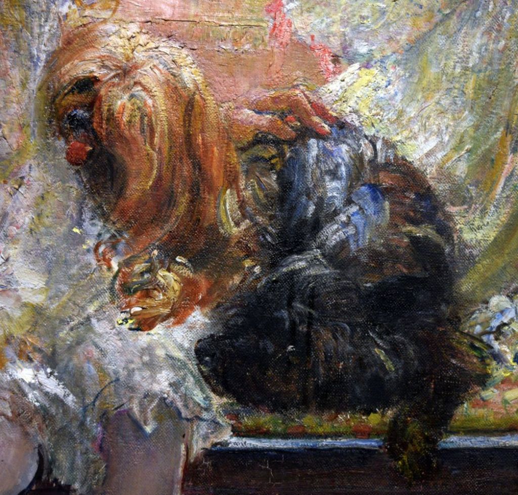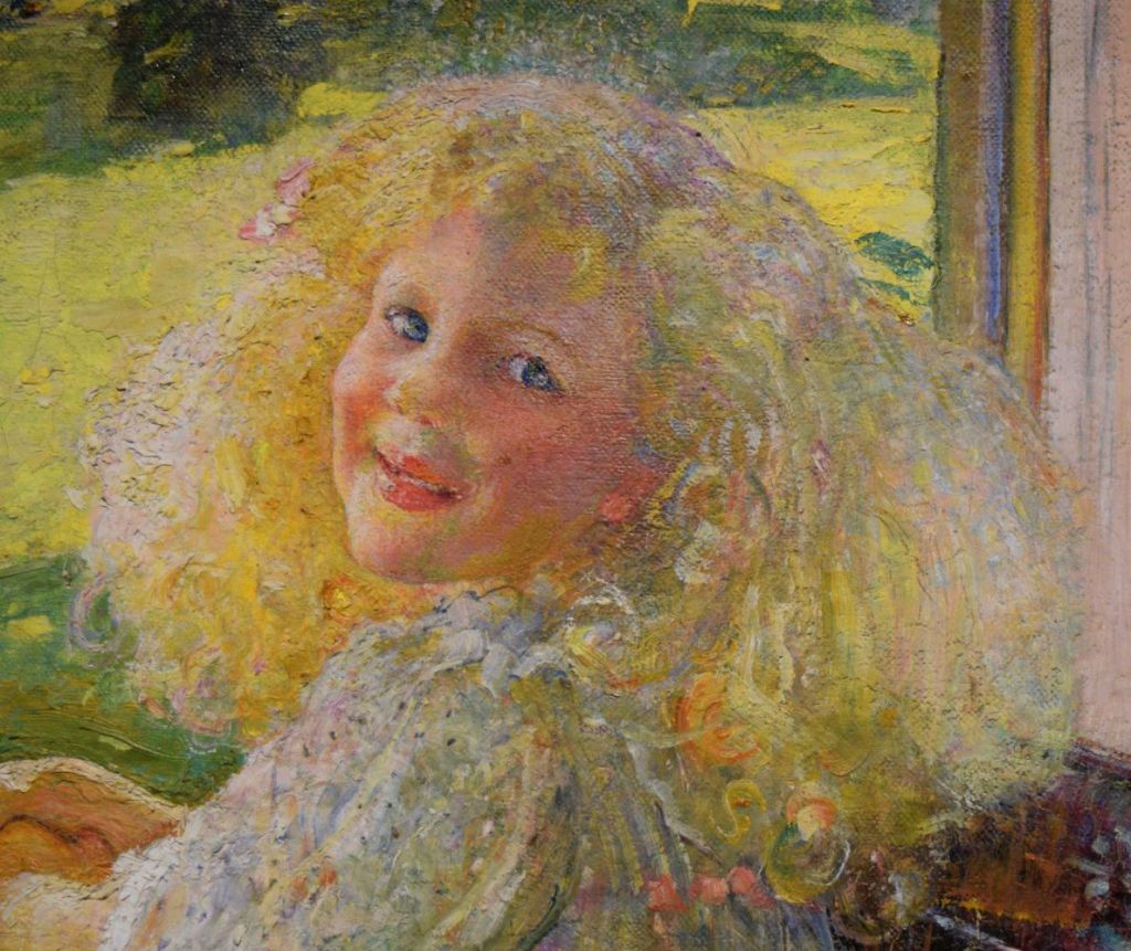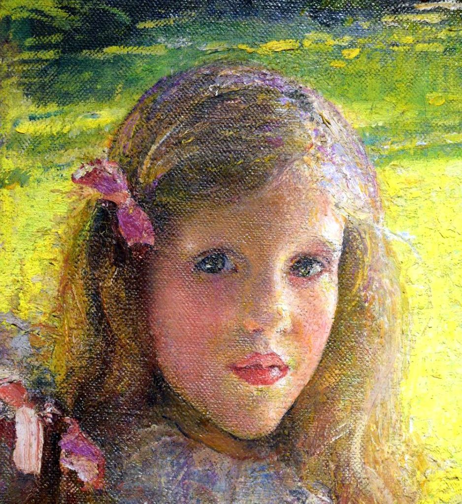 “Margaret (left) and Chrystian were the daughters of American-born Mary Guthrie (née Low). Swynnerton had painted her in around 1891 … The girls’ father, David Charles Guthrie was the 5th Baron of Cragie and, from 1892, of East Haddon Hall, Northamptonshire, where Swynnerton painted this portrait.” (From notice by painting while on display at Manchester Art Gallery, Painting Light and Hope exhibition, 2018-2019.)