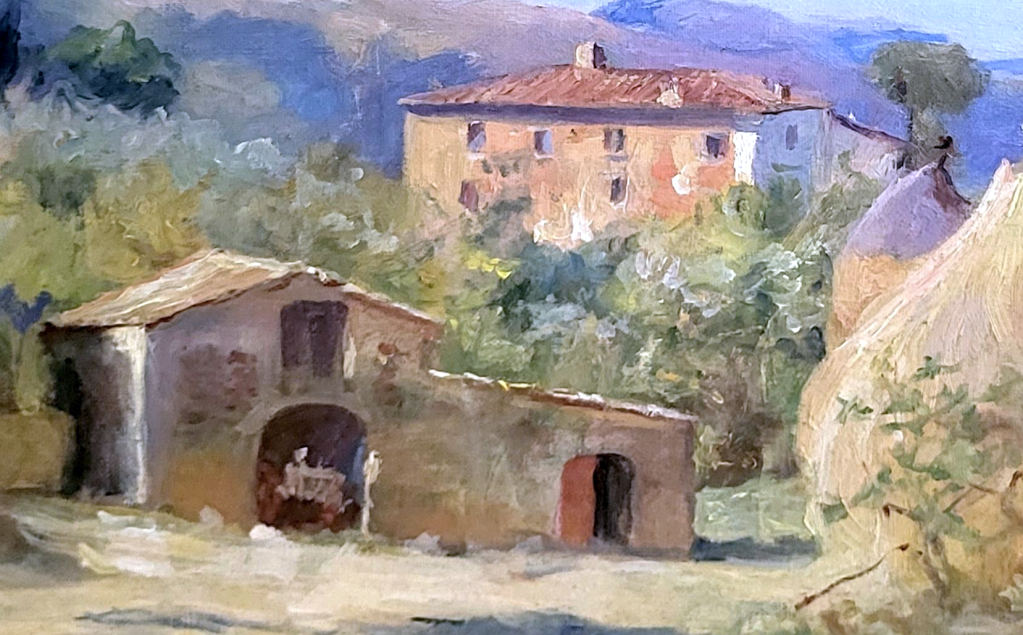 The Mancheser Art Gallery label is identical to one on Santa Maria Dei Monti, Perugia (1899). The frame is very similar to that of From a balcony at Perugia (1911) and Landscape with winding road (undated).
