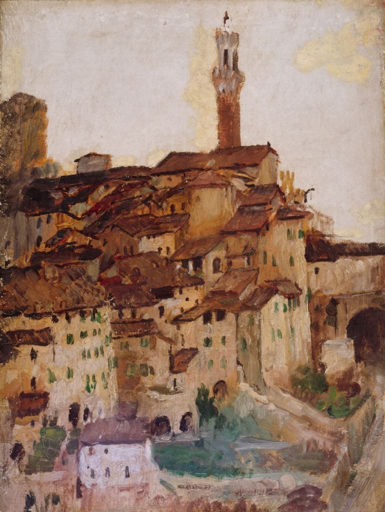 - Description: Oil sketch of a view in Siena, Italy, looking towards the Torre del Mangia.