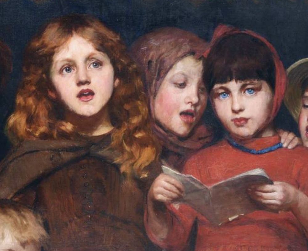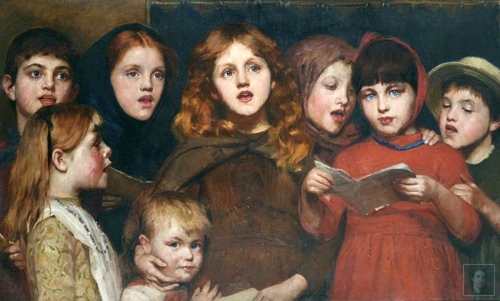 … “Singing Children” – is exceedingly fine. A group of eight children stand presumably in school, and six of them are singing with evident heartiness. Two or three of the little ones have song papers in their hands, and the others look over them with much earnestness. Two of the children, however, appear to be shy. They seem nervously conscious that they are being looked at, and they are silent, and their appearance furnishes a pleasing contrast to the vigous and gusto displayed by the others. There is a judicious blending of colours in this picture, and a finish which betokens much artistic taste and ability.