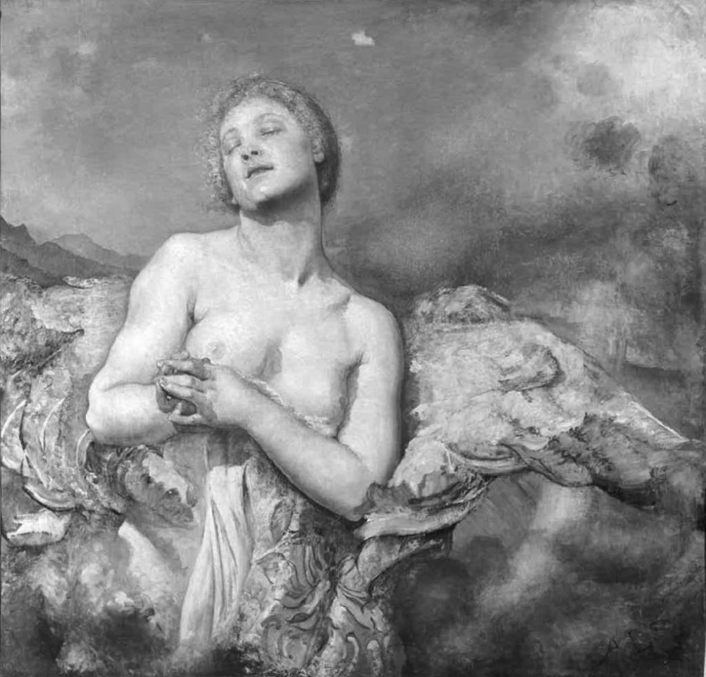 Mrs Swynnerton’s ‘St. Martin’s Summer’ is a most glad and confident painting. It should be seen as a decoration, making a single space of radiant colour, free of the confusions of colours surrounding it in a picture gallery. Her art is careless of particulars in this, as in other of her paintings. The wings of flamingo red are not organic to the figure, the painting of the clasped hands is cruelly raw. But the breadth and purity of the conception, the rose-tinted face with its close crown of golden hair, the body fair against the deep airy blue of the sky, have sweetness in their strength. (The Art Journal, 1909, p253.)