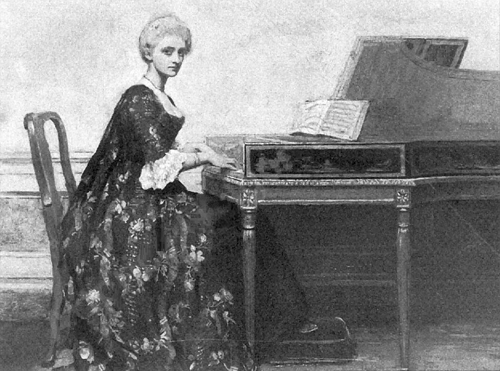 - Description: a woman wearing a dress with voluminous skirt, head and eyes turned towards the viewer, sits profile, hand on the keyboard of a harpsichord.