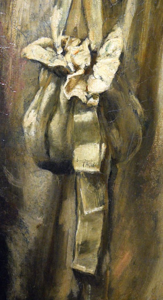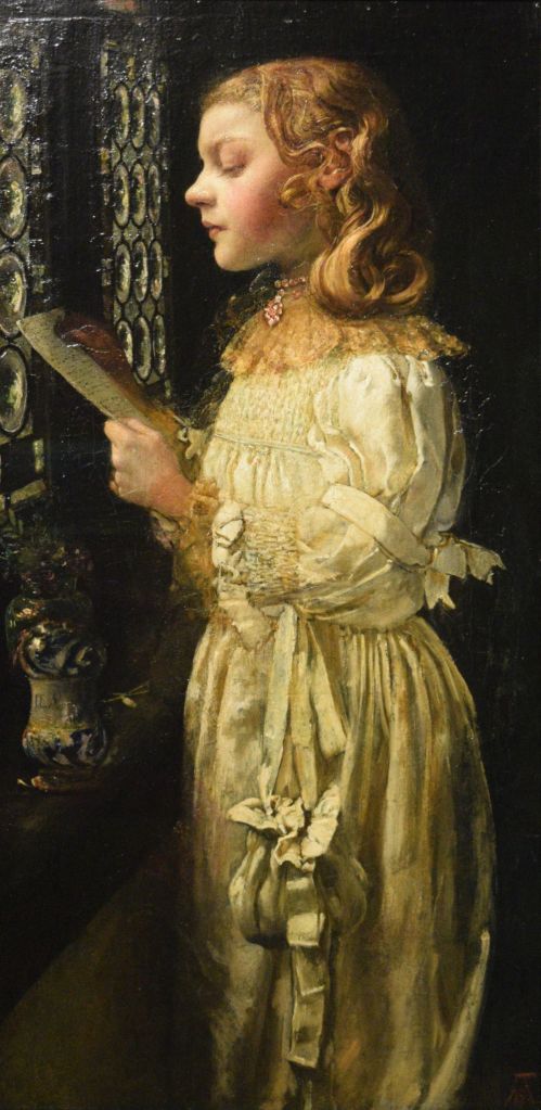- Description: A young, very well-dressed, girl stands in profile, facing to the viewer’s left, holding a letter in her hands (written words sketchily depicted but nothing readable by the viewer) which she is reading by the light of a window with ornate roundels, a couple of vases standing on the windowsill.