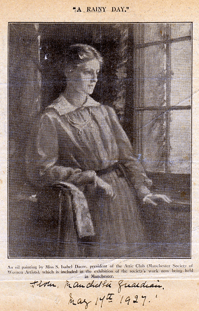 - 1927 – Exhibited “A Rainy Day … Manchester Society of Women Painter (Attic Club) #246″ (Manchester Guardian, 17 May 1927, image in newspaper confirming this work is the one referred to).