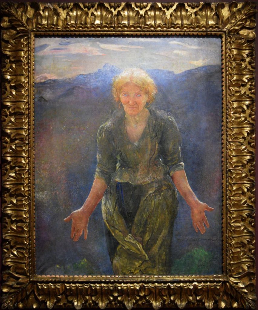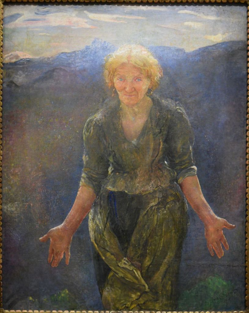 - Description: An older woman facing the viewer in a mountainous rural landscape, her arms spread apart, looking at and showing her palms to the viewer, wearing simple green shirt and skirt, gold earrings but no other jewellery; paintwork of impressionistic quality, not finely finished.