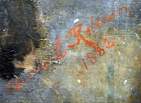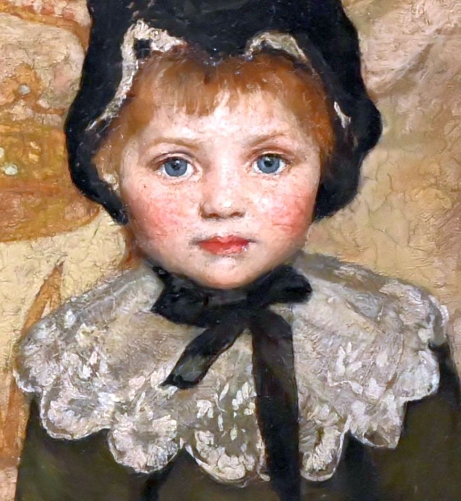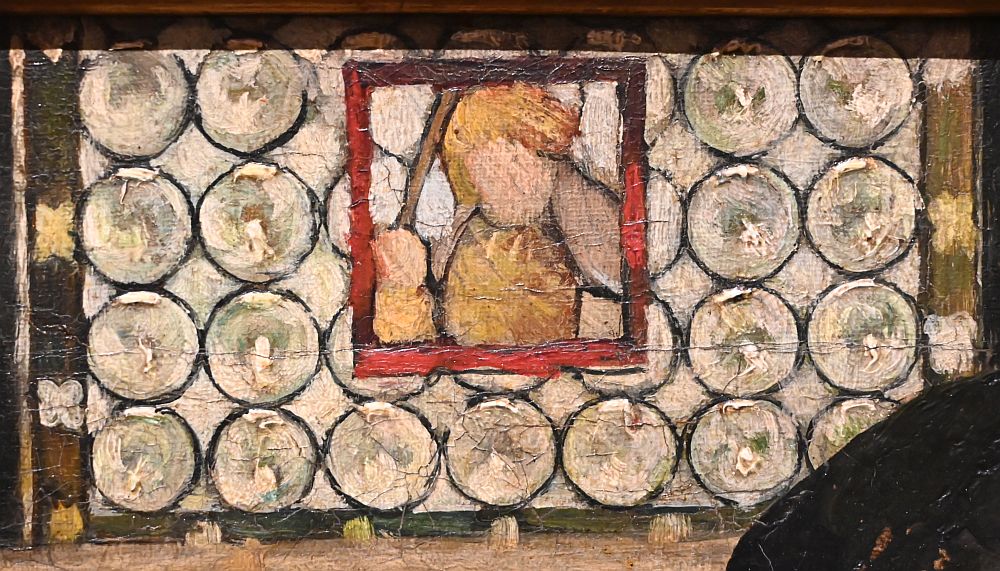 There are similarities, not exact but very close, in the window glass in this and Annie’s The Letter, adding weight to the argument that the latter is The Reading Girl, a painting mentioned in a newspaper article of the time [Manchester Evening News, 23 Nov 1883, p2, col. 2.] dates to c. 1883.