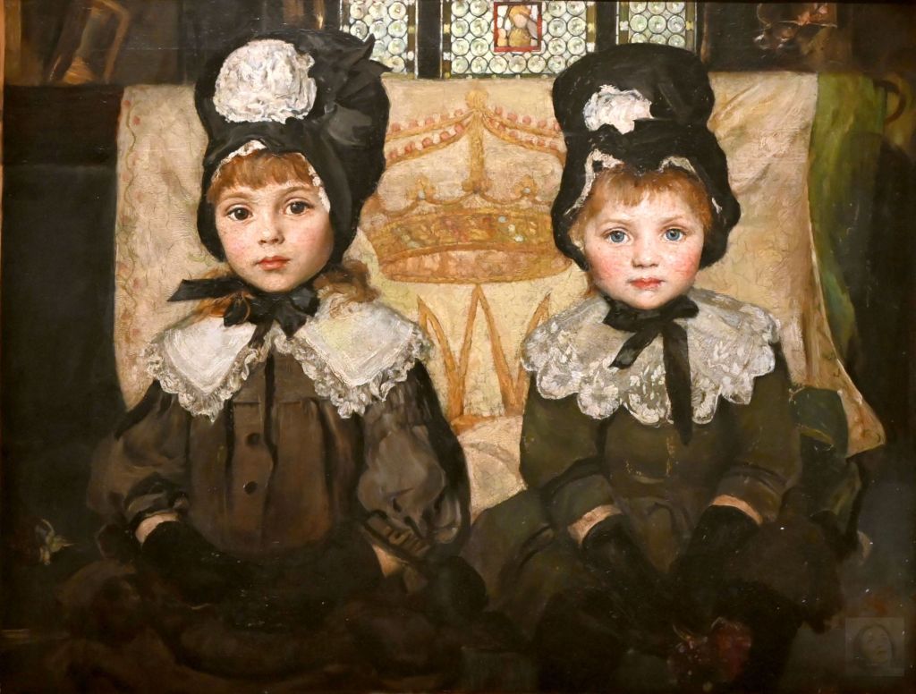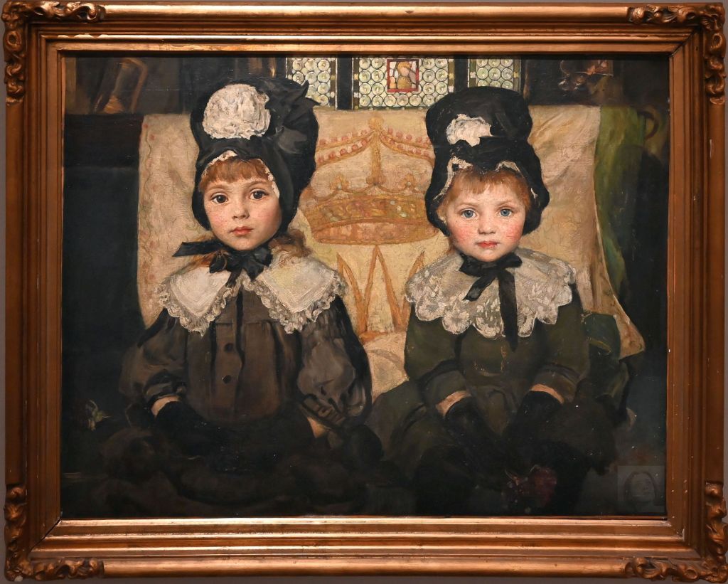 - Description: Two young children dressed in black, the hats and collars lace trimmed, sit on a sofa or bench-seat facing the viewer, a cloth bearing an embroidered crown and other designs draped over the back of the seat, in the background an ornate window with roundel and coloured glass; painting age-darkened, obscuring original colours.
