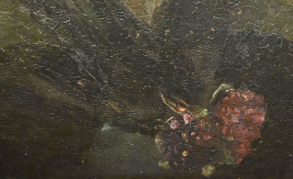 The condition report from Sotherby’s 2023 auction reads “The canvas has been lined. The paint surface is dirty in areas and there is pressed craquelure. Paint loss to certain sections mostly towards the lower right hand corner which appears to have bee retouched. Ultraviolet light reveals a layer of opaque varnish. There is evidence of retouching to the dresses, gloves, hats, and sections of the background, as well as some retouching to to address the areas of craquelure. The varnish has yellowed slightly.”