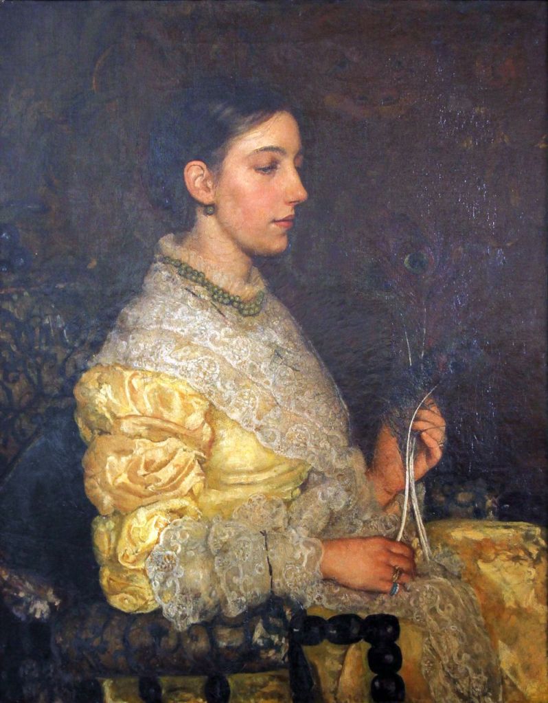 - Description: Upper body of a woman, seated in a chair, in near profile, wearing a yellow or gold dress with lace trim, necklace of green beads, rings on the outer fingers of her right hand and holding peacock feathers, background dark.