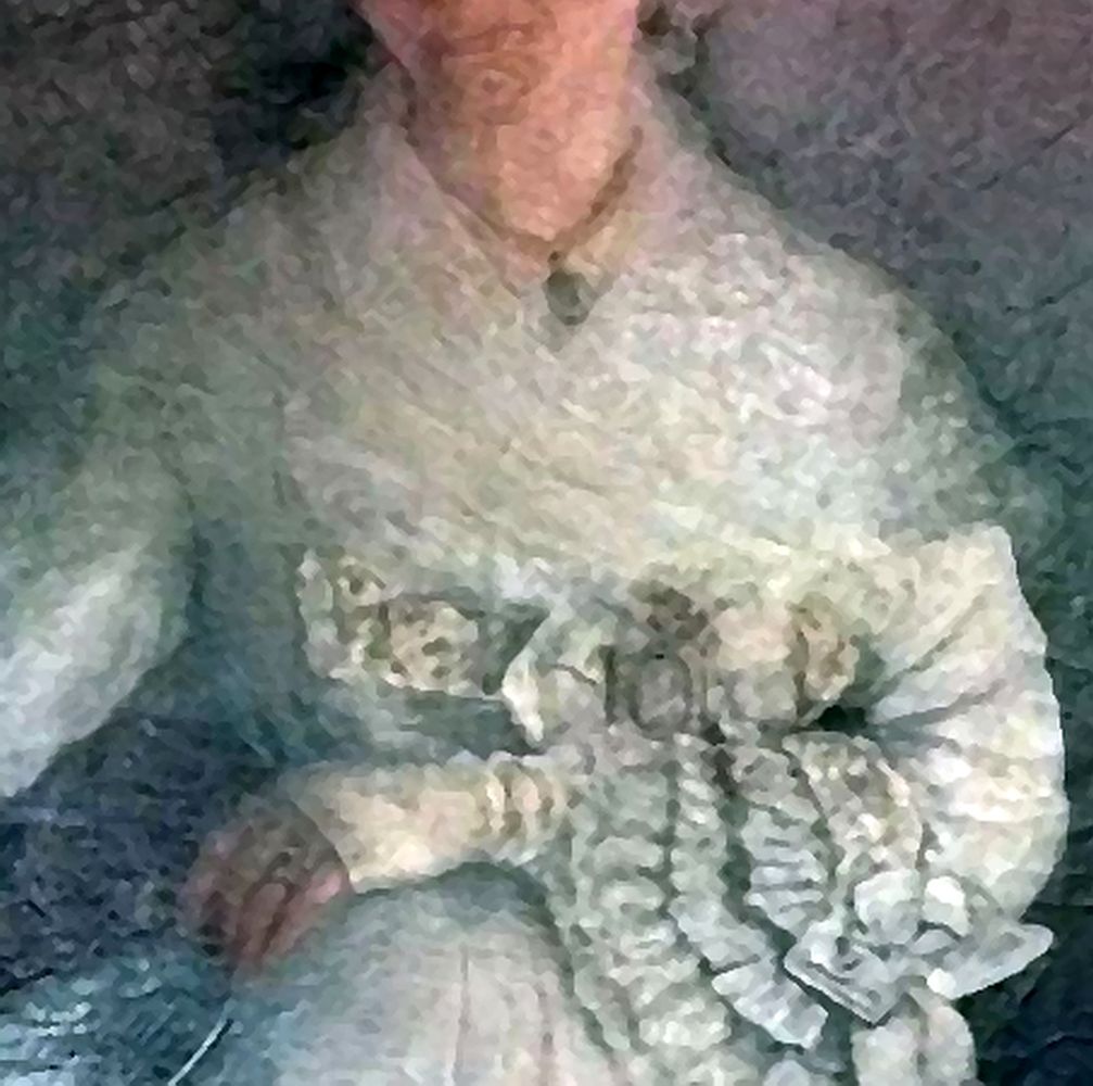 - Description: Unfinished bust portrait of a woman turned to her right, wearing a white bonnet.