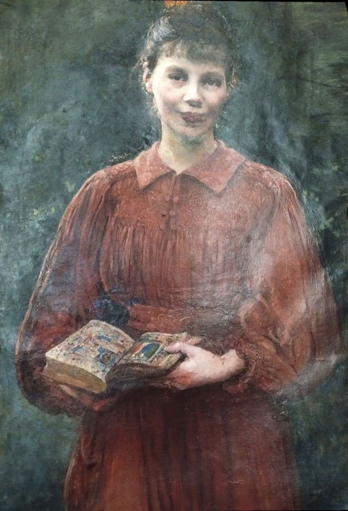 - Description: “An upright picture; girl in a simple red dress, holding in her hands and illuminated missal; wild hyacinths at her feet” (New Gallery catalogue, 1889).