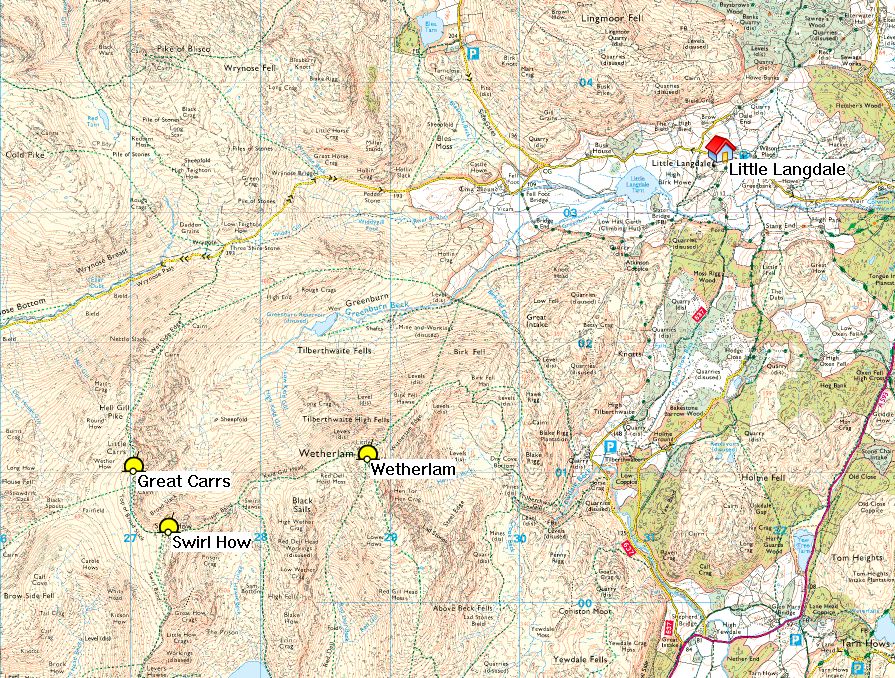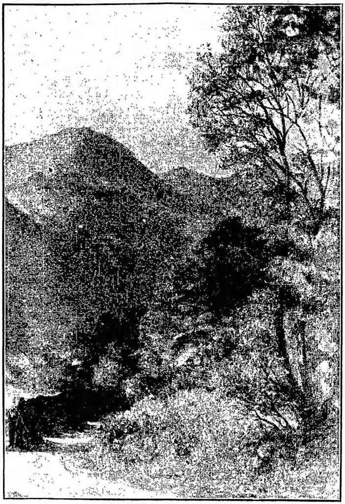 The place from where the scene was painted is unclear, possibly somewhere on the east side of Little Langdale village (NY318032). Wetherlam (2503ft/763m) is the prominant peak on the left of the picture, with Great Carrs (2575ft/785m) to the right. The higher peak of Swirl How (2633ft/802m) is hidden behind Wetherlam. Isabel has slightly exagerrated the vertical elevation or ‘pointiness’ of the hills.