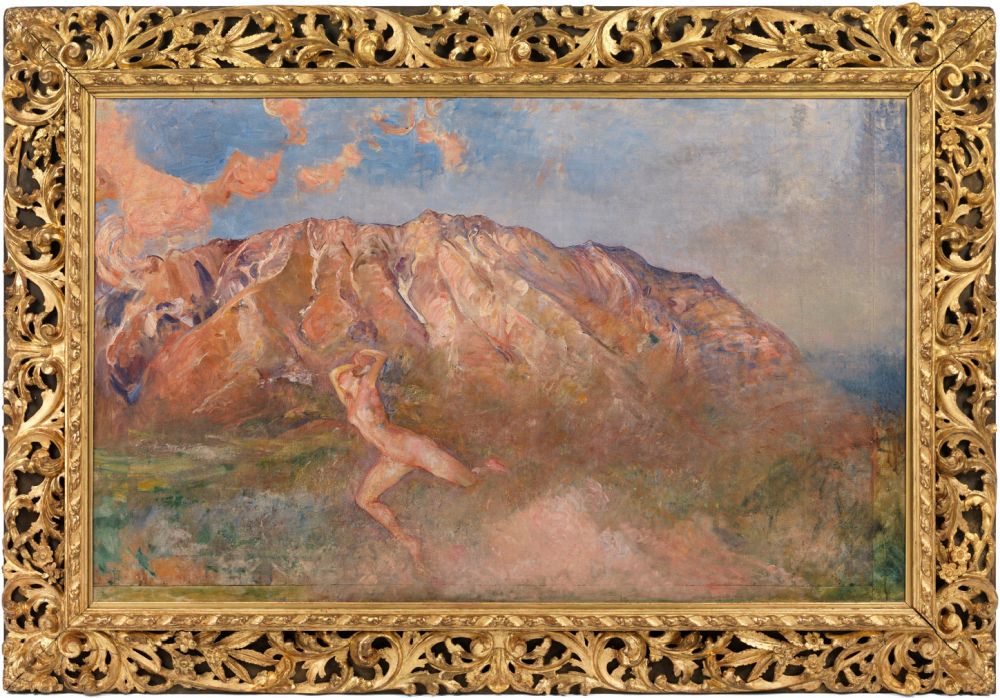 - Description: a mountain scene (Sprone Maraoni, 40 mi/60 km SE of Rome, Italy), with a nude female figure running from right to left, just off centre to the left, in the foreground, arms raised and face hidden; “a naked female figure floating in a rather barren mountainous landscape” (Glasgow Museums Resource Centre).