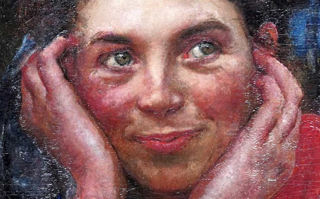 - Description: a young woman in red top resting on her elbows, hands cupping her face, eyes turned towards the upper right, background of trees against horizon, an single leafy spray crossing the frame diagonally obscuring the subjects elbows.